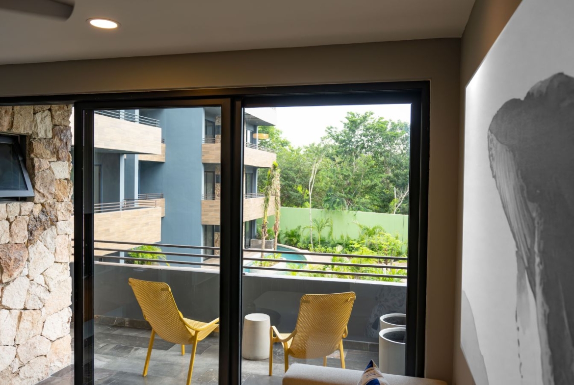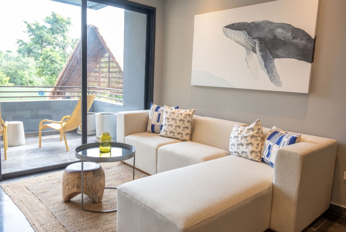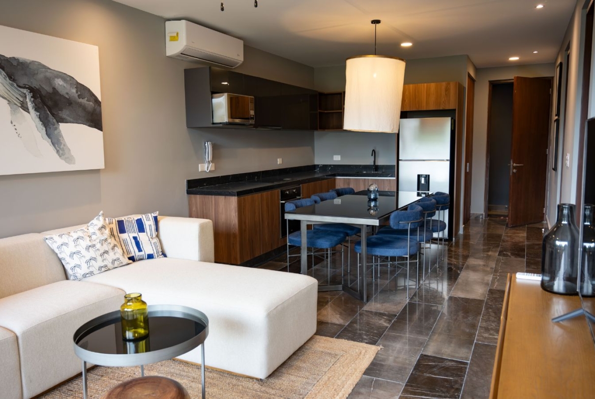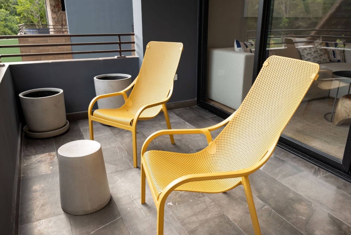 The design in dark shades create this unique contrast with the natural materials incorporated. Spaces are ore planned with the purpose of letting residents have this wellness sensation, having an amazing view to the jungle.